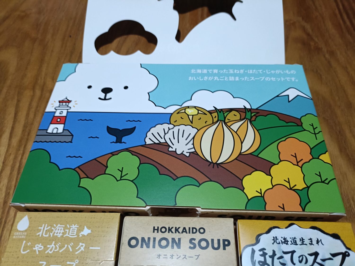 気まぐれ日記 2025年9月8日 思わず! みなさん こんにちは 先日、札幌に行った帰りの便で頂いたホタテのスープが美味しかったので機内販売で購入しました。 ホタテ、ジャガバター、オニオンスープの3点 24杯で1000円でした。 ふたを開けるとこんなデザインが。 スープは後日 アップします(笑)