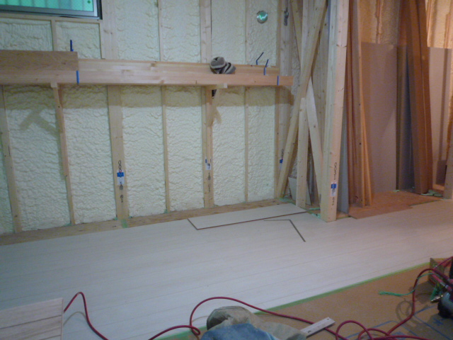 壁の間に隙間なく充填されているのがおわかり頂けると思います。何度か書きましたが、OB施主さんからエアコンをつけている時間が短くなったとか、暖房時間が少なくなった、音が少なくなったと実体験のお話を頂いています。初期投資は通常の断熱材よりもかかりますが、必ずメリットがあります。私がお願いしている設計事務所さんも採用します。