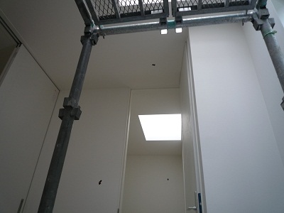 こちらはcasa cubeのクロス工事をしている途中の現場です。吹き抜けがあるので内部に足場がああります。もう少しで完成します。昨日Kさんと現場で打ち合わせをしてきました。養生がとれるとさらに内部の様子がはっきりわかります。