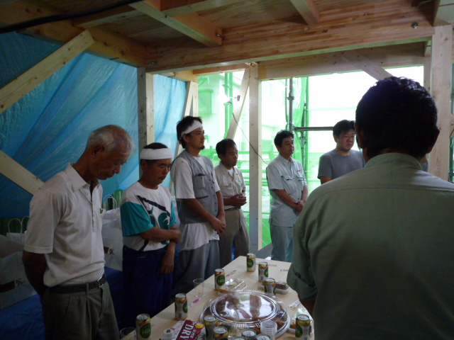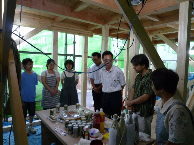 参加メンバーは当社のスタッフと大工さん設備やさん 電気やさん 鳶さん(基礎工事)です。いつもは行き帰り車ですから、お酒を頂戴できないのですが、今回は近い事もあり、少し頂きました。仲間からの依頼の仕事という事で、本当に嬉しく、気持ちが熱くなってしまいまた。