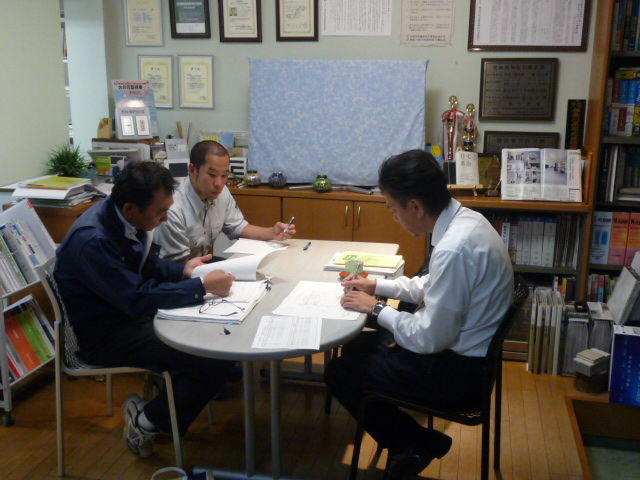 昨日夕方 パルの藤林さんが建具の打ち合わせに来てくれました。専務と研修中の津村君が同席しています。