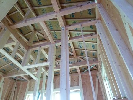 こちらの現場も発泡ウレタンを吹き付けて断熱性能を担保します。屋根との間に隙間をもうけて壁からの空気の流れをつくります。