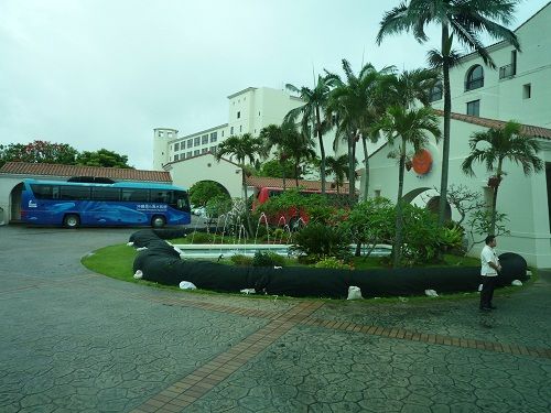 台風慣れしているせいか、植木の養生がなされています。(黒い網がかぶされているのがそうです。)