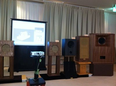 早起きしてしまい、ホテルにじっとしていられなく、9時に会場へ行ってしまいました。スタッフの方〃が打ち合わせをされていましたが、皆顔見知りのため、端っこで待機していた次第です。北は私、南は福岡から来られていました。1回の人数は50名程の限定です。個人的には交通費を払っても聞く価値のあるものだと思います。 正面のスピーカー群です。