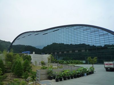 この建物です。どうですか? カーブのラインが素晴らしくガラス貼りです。中もこれでもつの?と言わんばかりの天井でした。構造計算をされた方はどんな人なのか、気になりました。