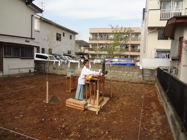 昨日 多摩区で地鎮祭を行いました。M田さん おめでとう御座います。神主さんも近くの方にお願いしました。いつも思うのですが、神主さんもエリアが決まっているようで、遠くへの出張はあまりなさらないようです。会社近くの住吉神社さんにお願いするのですが、今回のようにエリア外ですと、近くの神主さんを紹介してくれます。神主さんによって微妙にやり方が違いますので、事前の打ち合わせが大切になってきます。たとえばご自身で来てくれる方もいらっしゃれば、お迎えに伺わなくてはいけないケースもあります。持っていく物が違う場合もあります。