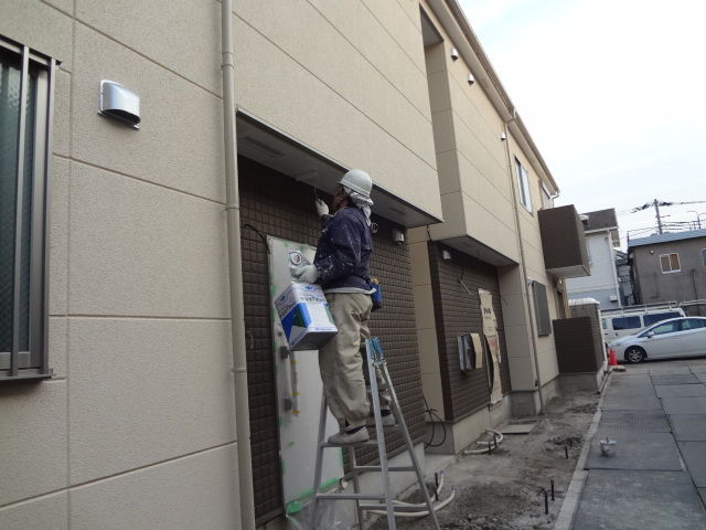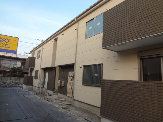 近くの現場の足場がとれました。左右対称の建物で2月にお引き渡し予定です。外部の仕上げがALC【軽量発泡コンクリート】です。