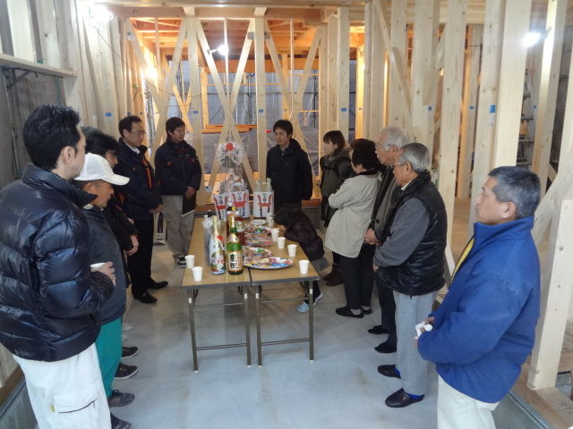 式の前にA井様 ご夫妻に現場を見て頂きました。時々状況を見に来られているのですが、中に入って骨組をキチンと見るのはおそらく初めてではないでしょうか。子供たちも大はしゃぎで、ハシゴに登ったり、床面から飛び跳ねてみたりで大喜びでした。