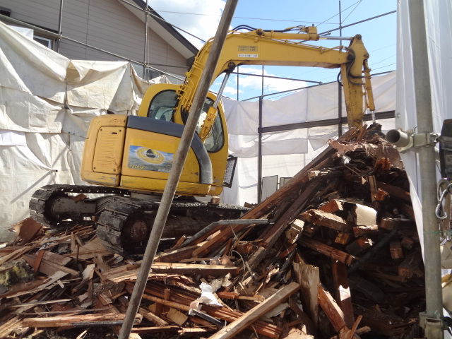 ほぼ壊し終わりです。残材をかたずけて、分別していきます。そして基礎を撤去するのですが、こちらが大変です。解体というと荒っぽそうに感じますが、けっしてそうではありません。丁寧かつ慎重に壊して行ってくれます。現場の様子は