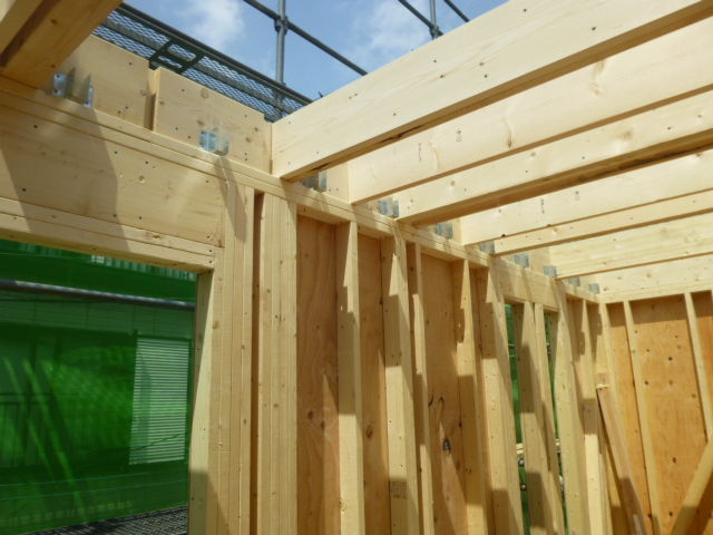 中原区で、2×4工法 3階建ての枠組みが進んでいます。狭小地ではありますが、奥様が少しでも使いやすく、動線が良いようにとのご希望で、今回の間取りとなっています。2方向道路で、建築面積は7割とれるのですが、道路斜線がかかりますので、天空率を使って有利に働くよう、設計しています。来週には骨組みが出来上がる予定で、進めています。