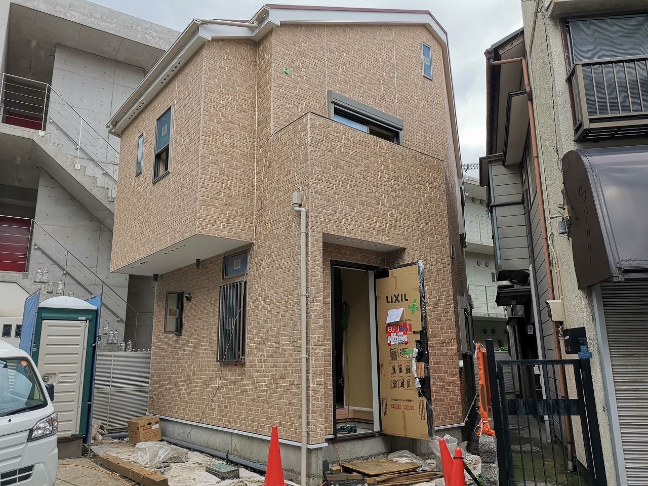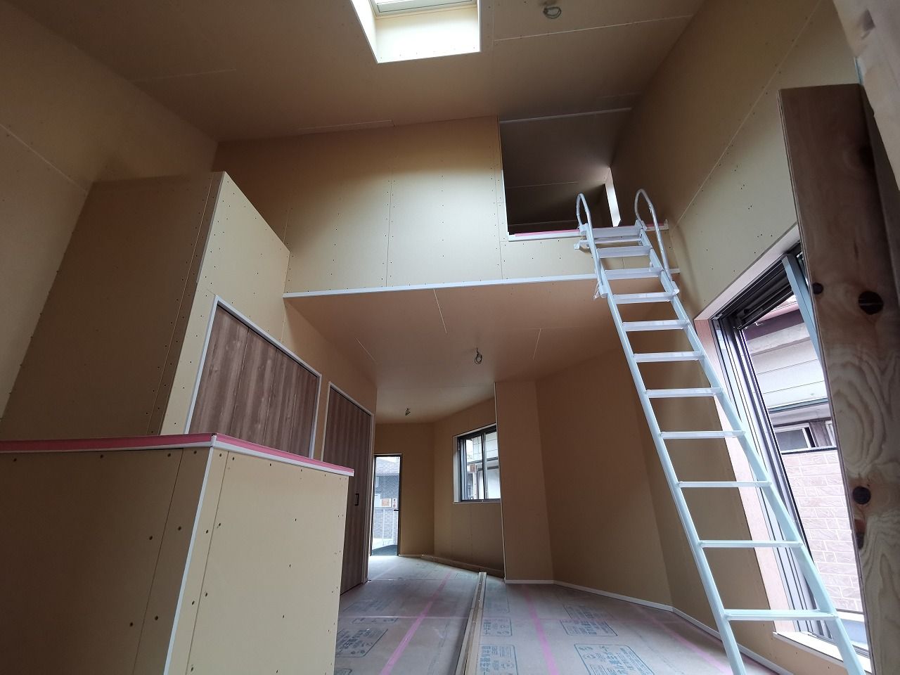 気まぐれ日記 2019年6月14日 もうひといきで みなさん おはようございます。 幸区の現場、足場が取れました。 三角の敷地に合わせた角度のある建物となります。 2階は これからクロス工事が始まります。勾配天井やトップライトの光が空間を広げています。完成が楽しみです!