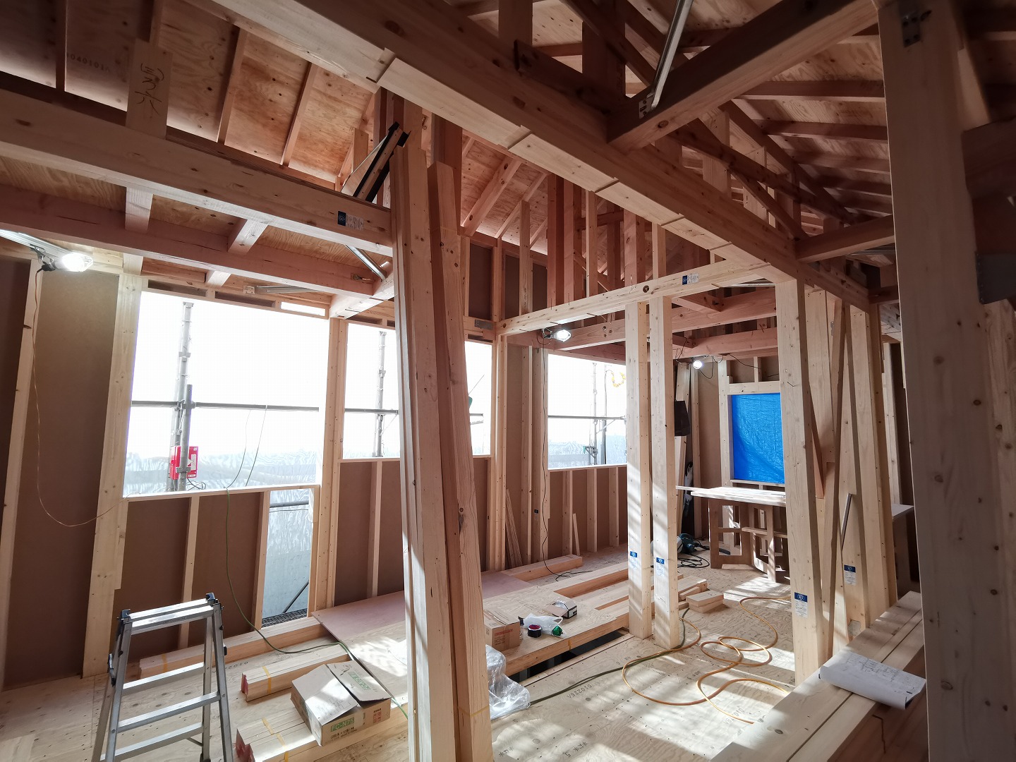 目黒区で建てています、現場の様子です。柱は4寸です。これからサッシを取り付けます。