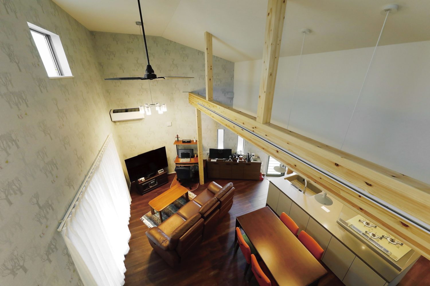 ロフトからの眺め。天井のファンが夏も冬も空気を循環させ快適な室温をキープ。