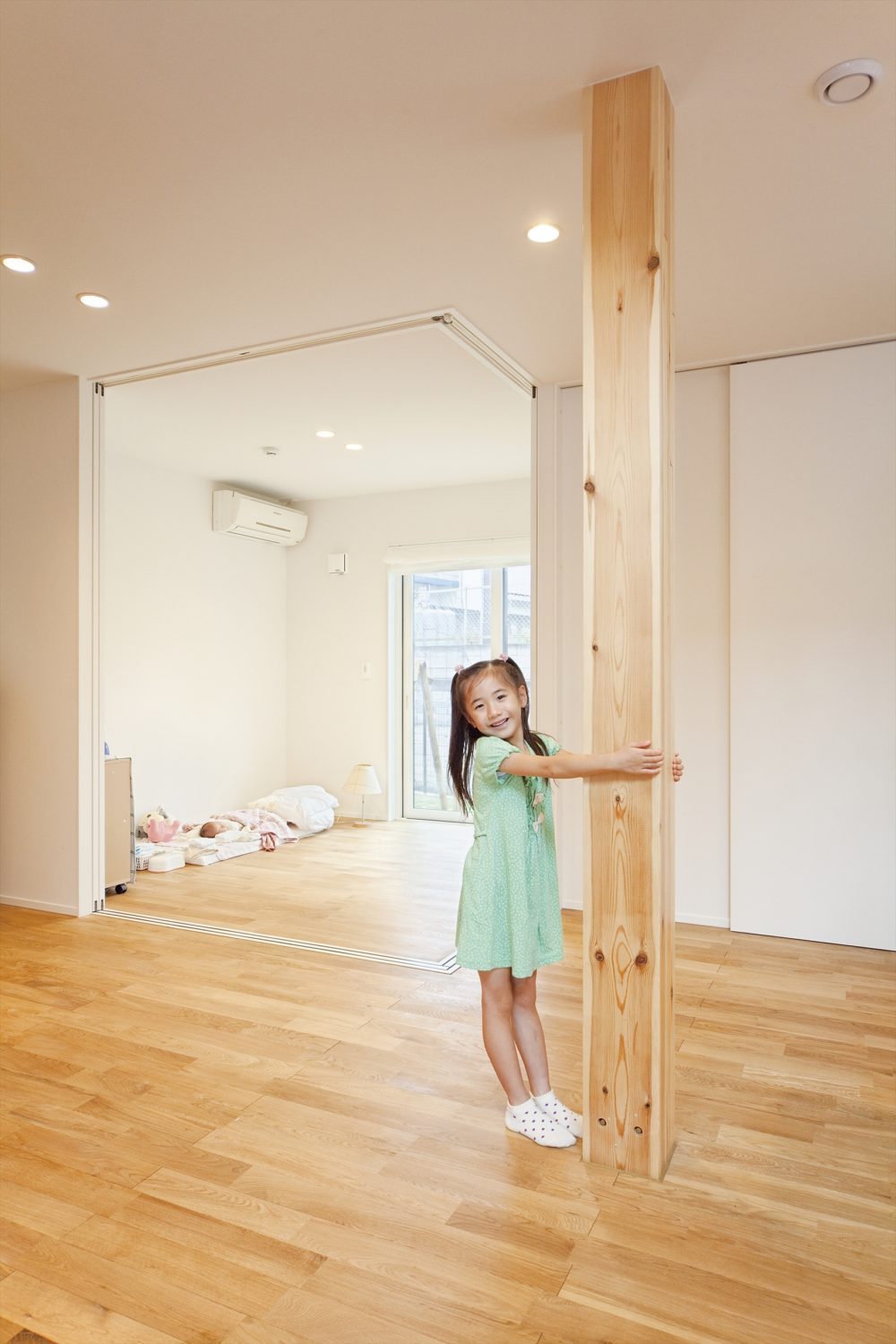 建物中央にある15cm角の大黒柱。建物をしっかり支え、2階の間取りを自由に組み替えることが可能だ