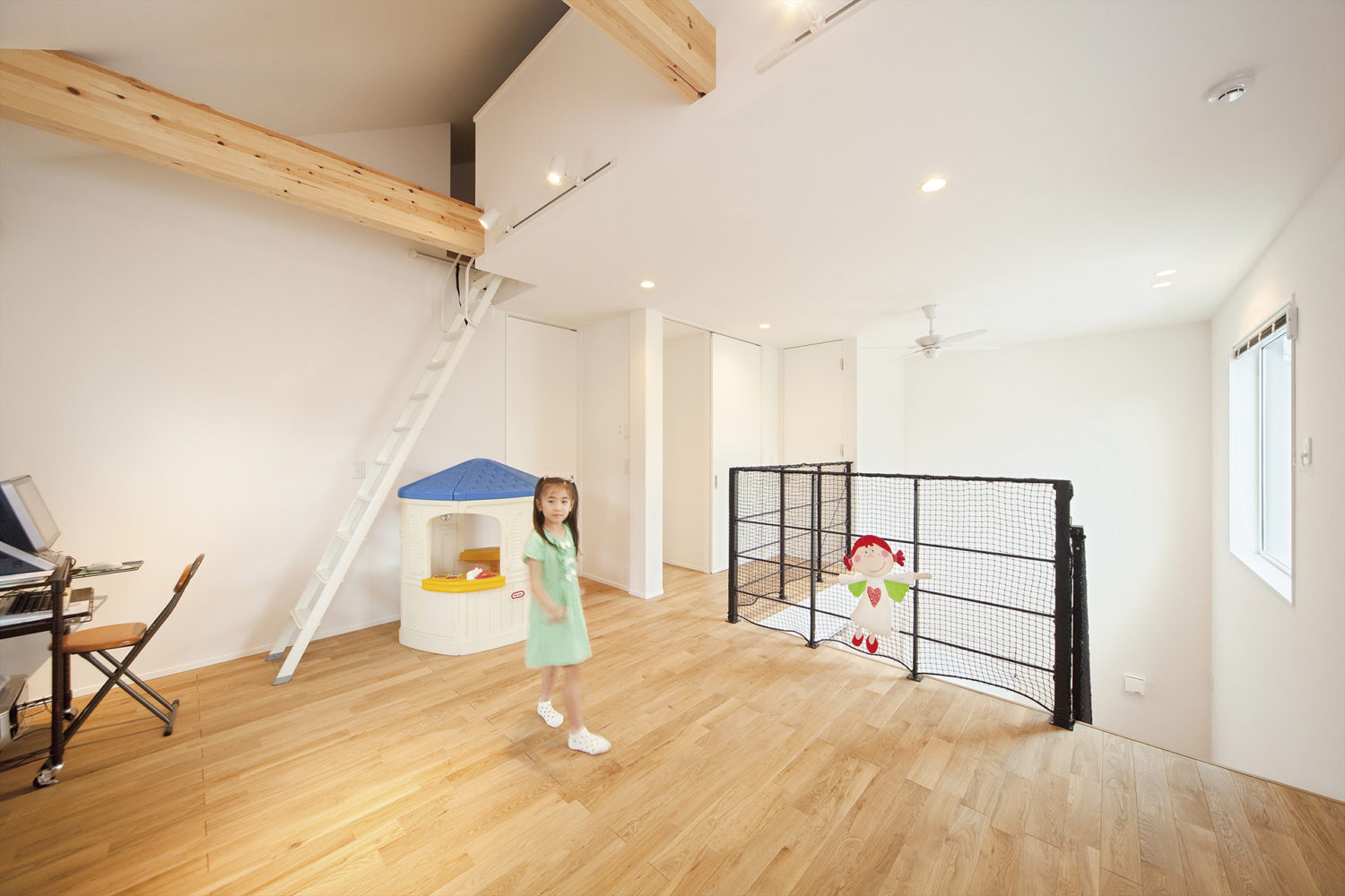 勾配屋根を利用しロフトを設けた2階フリースペース。無垢の床を採用し、温かみのある空間