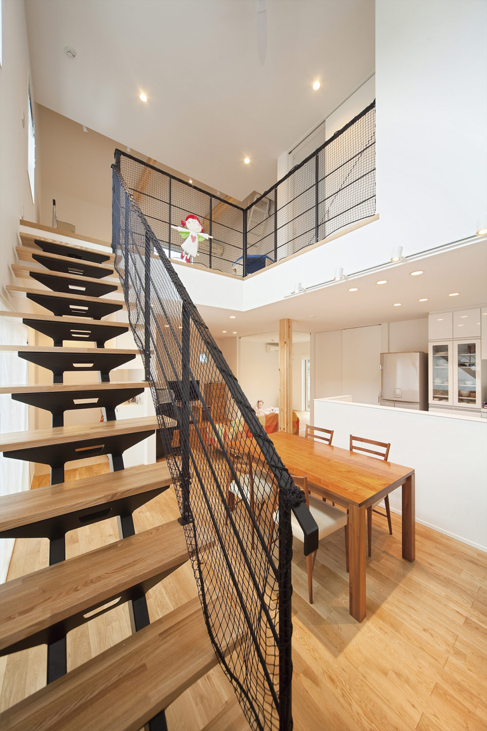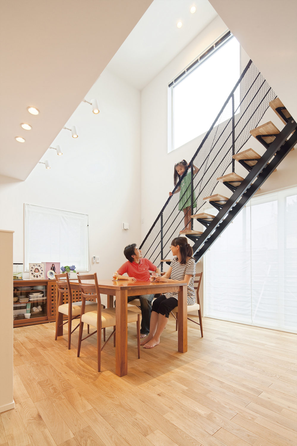 1階のLDKと2階をゆるやかにつなげるストリップ階段が、開放感あふれる空間を演出