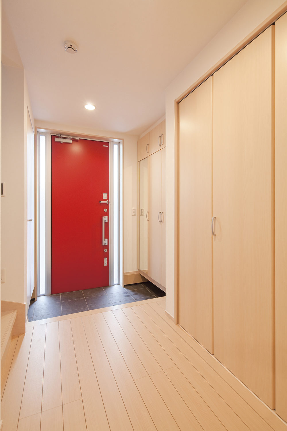 表側と同様裏側も赤にして、空間を賑やかに。土間収納も設け、すっきりした玄関に