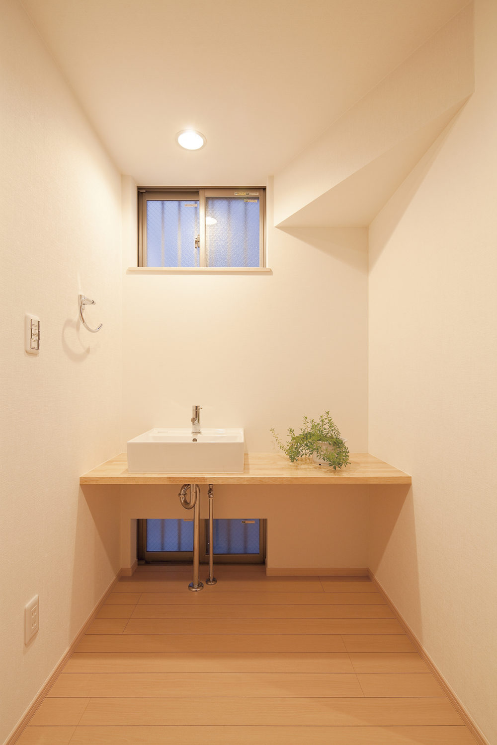 玄関で目を引くのは造作のお洒落な洗面台。高窓と地窓で採光と風通しに配慮