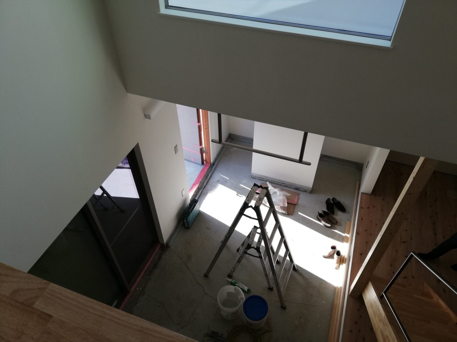 D's スタイル 2021年2月12日 杉 無垢30mmの床 みなさん おはようございます。 泉区で建てていますD’sスタイルのお家、クリーニングが終わり、最終段階になっています。 吹き抜けが大きいです。シャッターが閉まっていますので、実際はもっと明るいです。 収納ラック、飾りつけも出来、実用的です。
