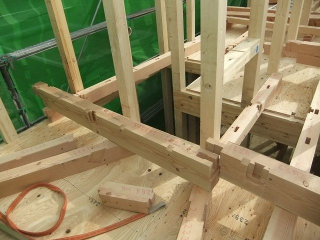 1階の柱が建ち、2F床の梁が組み込まれているところ。奥に見える柱は通し柱といいまして、何本か、1Fから2Fまで繋がるように1本が6mの長い柱を使用します。