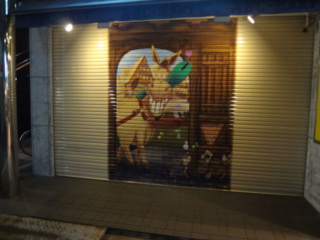 アンコールも2曲程 演奏され、余韻が残るまま帰路について元住吉商店街を歩いていると、数店のシャッターに描かれている物を見つけたのです。 夜 この辺をあまり歩かないので気が付かなかったのです。