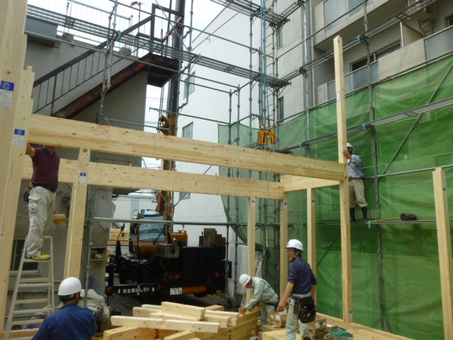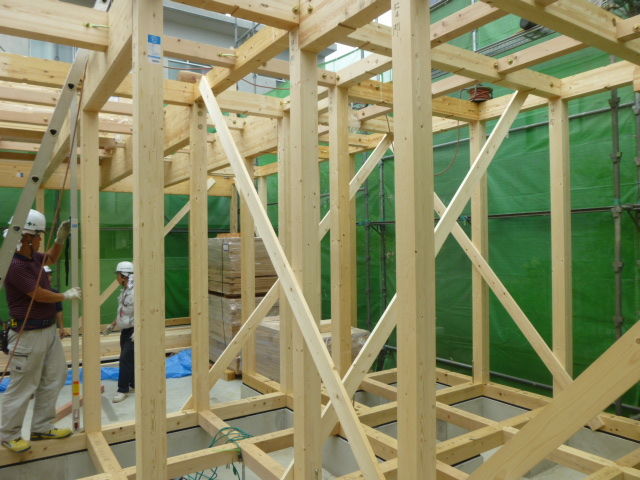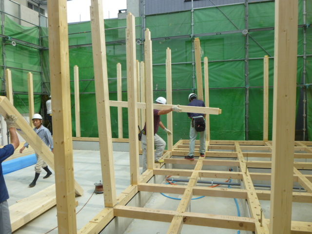 初日は1Fの梁まで、組み上げ完了です。 金物が多いので、締め込みに時間がかかりました。続きは後程に。